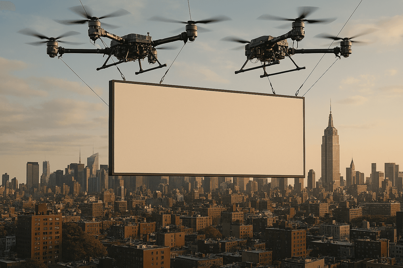 A power-tethered aerial platform can lift large LED-mesh screens high into the sky, creating instantly deployable, highly visible displays for advertising or event information.